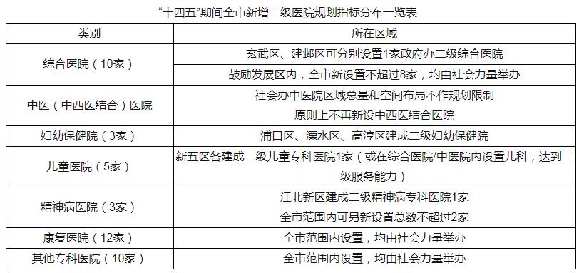 到“十四五”末,全市可新增二级医院不超过43家(社会办中医院除外),其中综合医院10家,妇幼保健院3家,儿童医院5家,精神病医院3家,康复医院12家,其他专科医院10家。